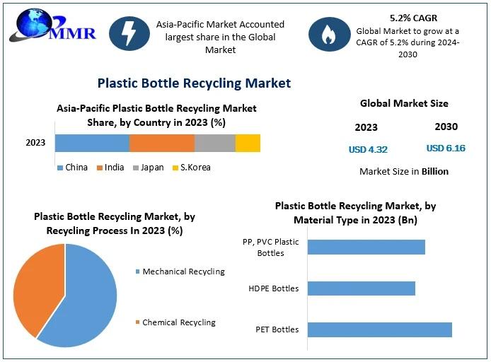 Anticipated Growth in Revenue: The Plastic Bottle Recycling Market size was valued at USD 4.32 Bn in 2023 and is expected to reach USD 6.16 Bn by 2030, at a CAGR of 5.2 %.