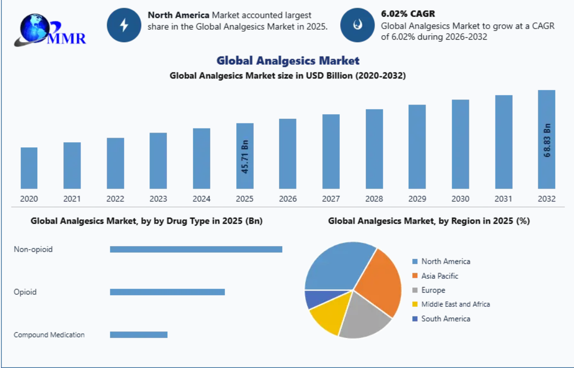 The global analgesics market is poised for steady growth, driven by the increasing need for effective pain management across a wide range of medical conditions. According to the latest analysis by Maximize Market Research, the market was valued at USD 45.71 billion in 2025 and is projected to reach nearly USD 68.83 billion by 2032, expanding at a CAGR of 6.02% during 2026–2032.