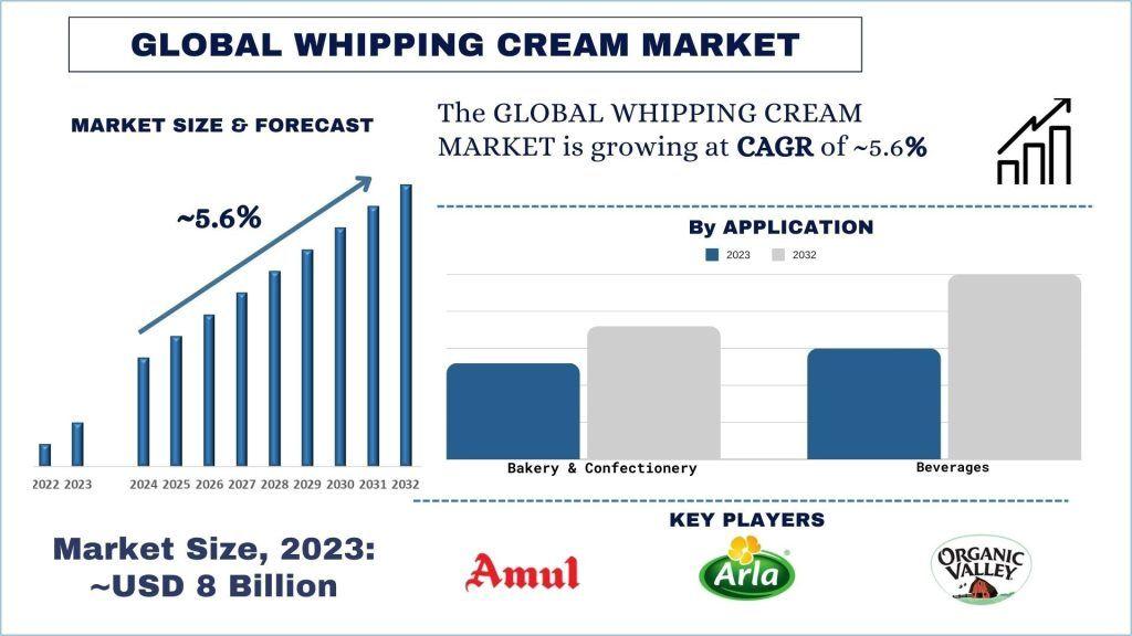 The Whipping Cream Market was valued at approximately ~USD 8 Billion and is expected to grow at a strong CAGR of around 5.6% during the forecast period (2024-2032)
