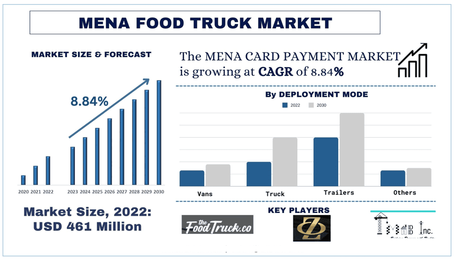 The MENA Food Truck Market was valued at USD 461.26 Million in 2022 and is expected to grow at a strong CAGR of around 8.84% during the forecast period (2023-2030)
