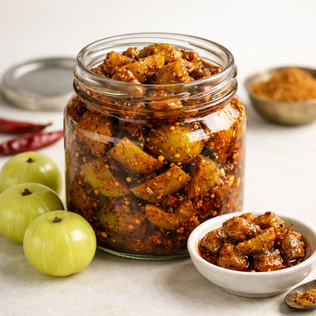 Amla, also known as Indian gooseberry, is valued not just for its taste but for its nutritional depth. It carries an intense sourness that mellows beautifully when cured with salt, oil, and spices. This transformation creates a pickle that feels bold yet grounding.