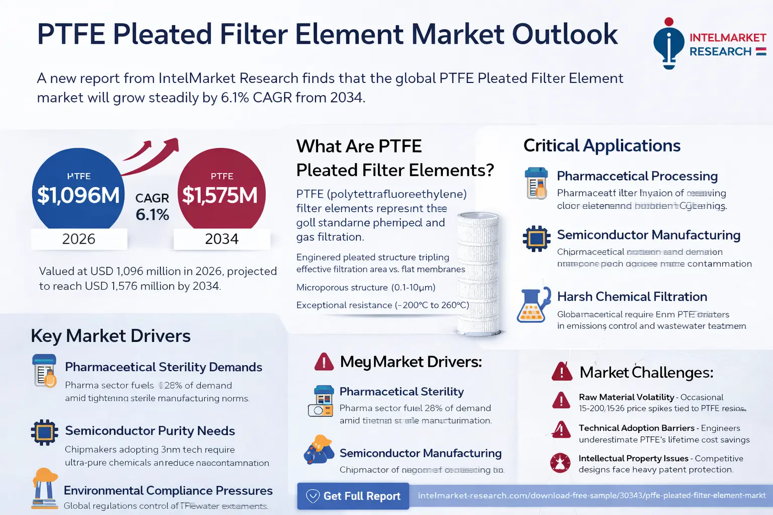 PTFE Pleated Filter Element Market to Reach USD 1.58 Billion by 2034, Growing at a CAGR of 6.1% According to a new report from Intel Market Research,Global PTFE Pleated Filter Element market was valued at USD 1,096 million in 2026 and is projected to reach USD 1,575 million by 2034, growing at a steady CAGR of 6.1% during the forecast period. This expansion reflects critical needs across pharmaceutical processing, semiconductor manufacturing, and harsh chemical filtration applications where traditional filters fail to perform. What Are PTFE Pleated Filter Elements? PTFE (polytetrafluoroethylene) pleated filter elements represent the gold standard in high-performance liquid and gas filtration. These specialized components combine a PTFE membrane's inert chemical properties with an engineered pleated structure that triples the effective filtration area compared to flat membranes. Their microporous structure (0.1-10µm) delivers absolute filtration while maintaining exceptional flow rates - a critical advantage in industrial processes where downtime means lost revenue. Unlike conventional filters, PTFE pleated elements maintain integrity across extreme conditions: from -200°C cryogenic applications to 260°C steam sterilization cycles, with complete resistance to all acids, alkalis (pH 0-14), and organic solvents. This makes them indispensable in industries like biopharma manufacturing where leachables/ extractables could compromise product quality. 📥 Download Sample Report: https://www.intelmarketresearch.com/download-free-sample/30343/ptfe-pleated-filter-element-market